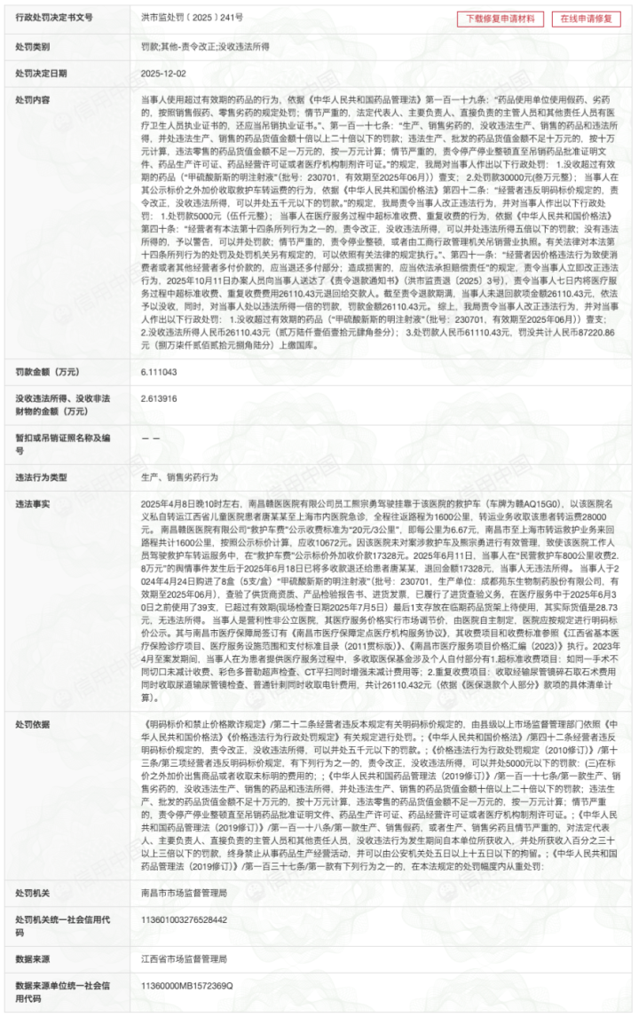 信用中国网站显示,12月2日,南昌赣医医院有限公司因生产、销售劣药行为,被南昌市市场监督管理局罚款6.1万余元,没收2.6万余元。